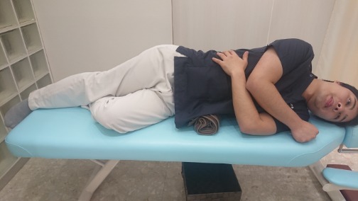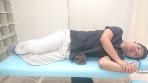 ・1 骨盤が高くなっている側を上に、横向きで寝ころび、ウエストの下に丸めたバスタオルを入れます。