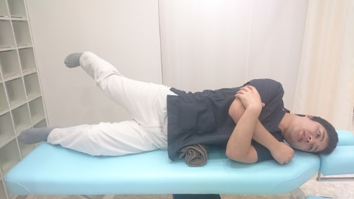 ・2 下側になっている膝を軽く曲げ、上側の足を伸ばします