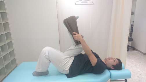 ・1 仰向けに寝て、両膝を立てる。右足を上に上げて、足裏にタオルを引っかけて、手前に引き寄せる。