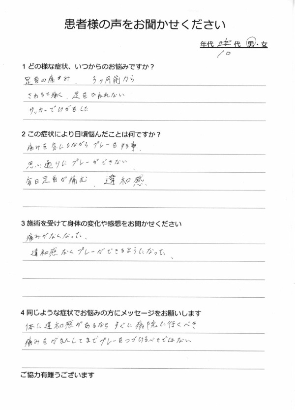 プレー時の踏み込み時の痛み→まだ痛みは出るが今までよりかなり楽になったとのこと